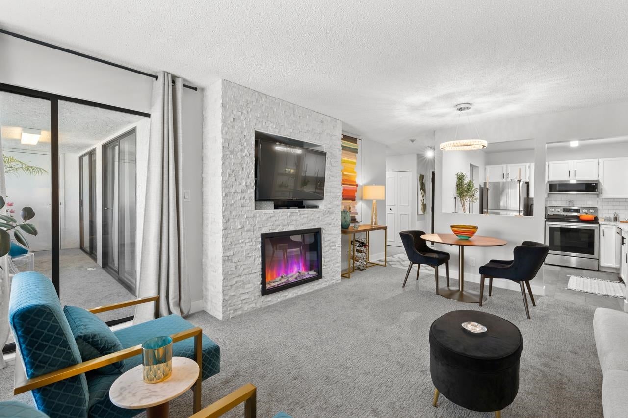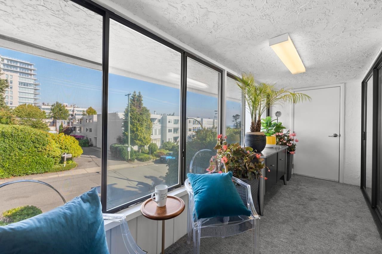 Beautifully renovated condo in the heart of White Rock, perfect as a full-time home or weekend retreat. Just a short walk to shopping, transit, and minutes from the beach. The enclosed sunroom offers year-round enjoyment with partial ocean views of Semiahmoo Bay. The updated eat-in kitchen boasts white quartz counters, new backsplash, refreshed cabinets, and stainless steel appliances. The living room features a custom fireplace wall, while both bathrooms have been redone with quartz counters, new sinks, faucets, lighting, and fixtures. New high-grade carpet and vinyl plank flooring throughout complete this move-in ready home.